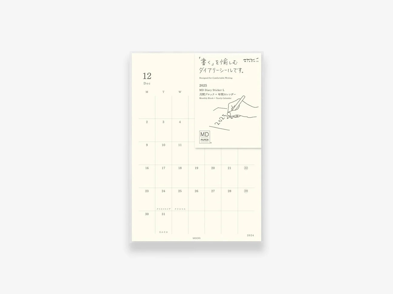 The Midori 2026 MD Diary Sticker L is a monthly planner in the form of sticky pages, made from their signature MD Paper. It features 14 monthly stickers ranging from December 2025 – January 2027, as well as two annual stickers for 2026 & 2027. These diary stickers allow you to transform any notebook or page into a calendar.