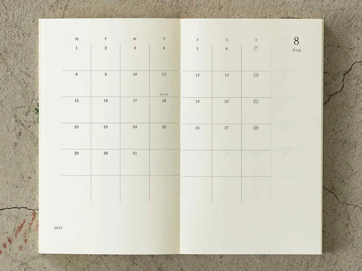 Each month is laid out in a beautifully zen-like design. The margins of the monthly pages are kept somewhat wider than you might expect, but this has a purpose; it allows for extra space to write down memo’s, to-do’s or reminders. Use it for writing, as a day to day notebook or create personalized weekly spreads to plan days ahead.