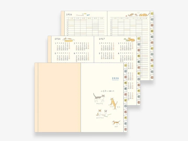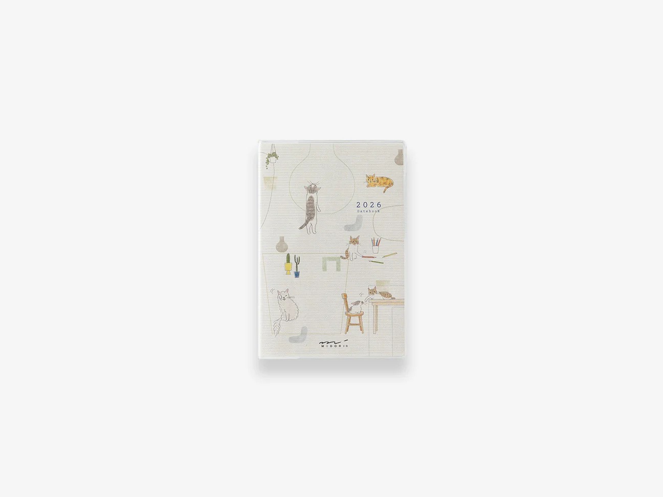 The Midori 2026 Pocket Diary Mini Cat is a pocket-sized diary with a monthly layout, running from January 2026 – March 2027. Comes in a PVC cover with pen holder, featuring cat illustrations by Ms. Sayo Koizumi.