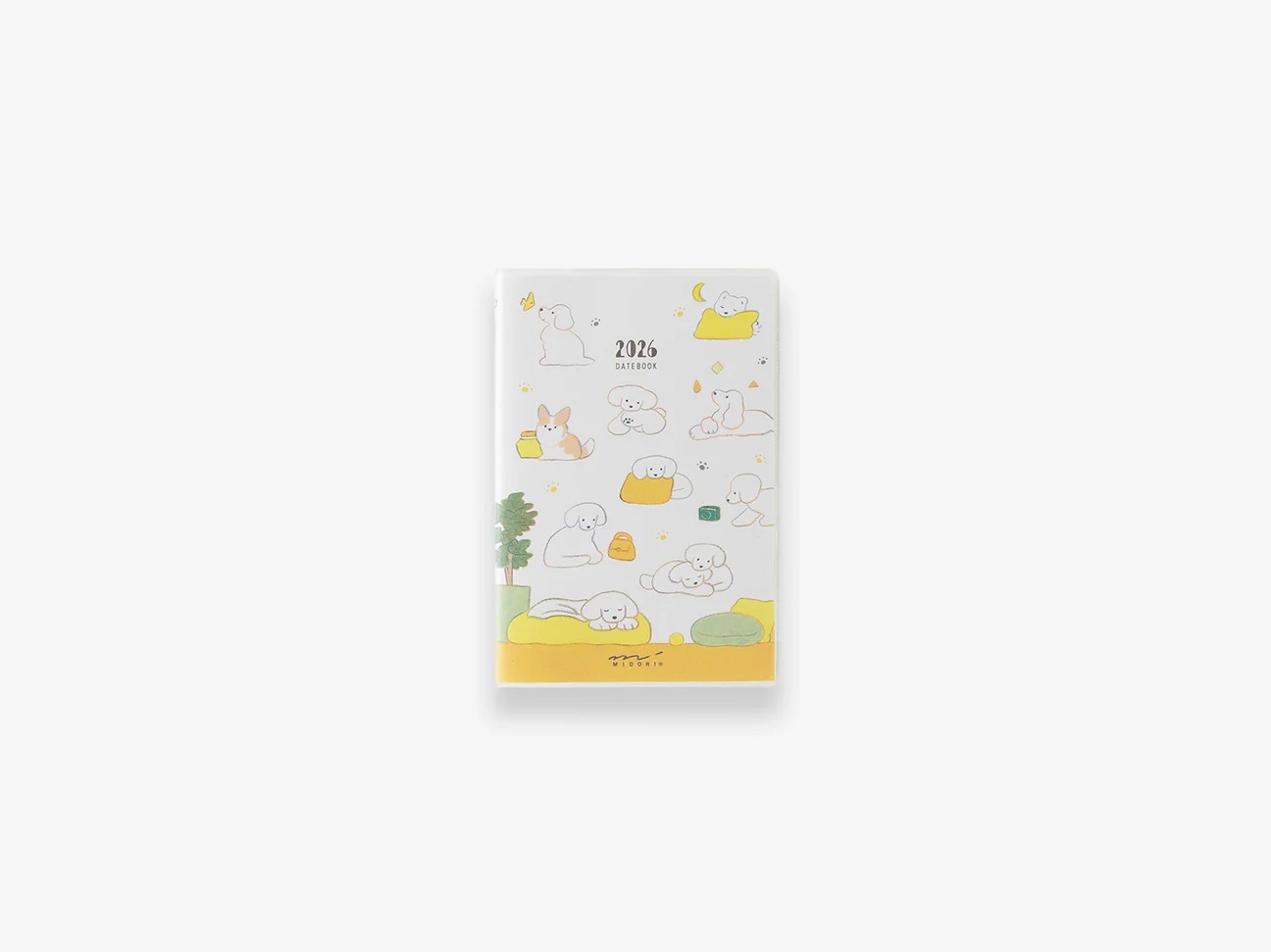 The Midori 2026 Pocket Diary Mini Dog is a pocket-sized diary with a monthly layout, running from January 2026 – March 2027. Comes in a PVC cover with pen holder, featuring dog illustrations by Ms. Natsumi Teraoka.