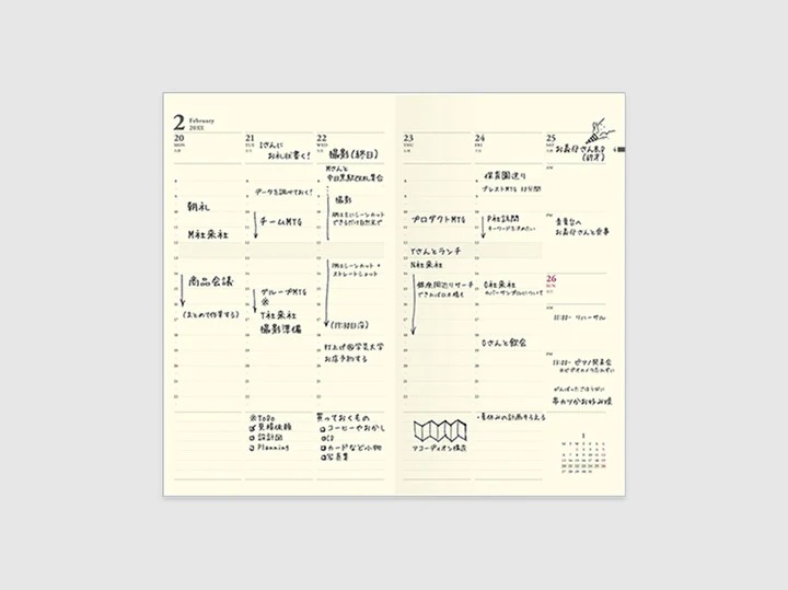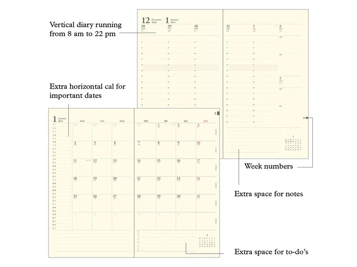 The Midori 2026 Professional Diary PRD Weekly Vertical Slim is part of Midori’s diary concept geared towards the business person. Running from December 2025 – January 2027, the diary has a combination of monthly and weekly overviews. Each weekly spread is laid out in vertical columns. According to Midori, this setup allows you to seize the flow of work per month, providing more detailed schedule management in the time axis.