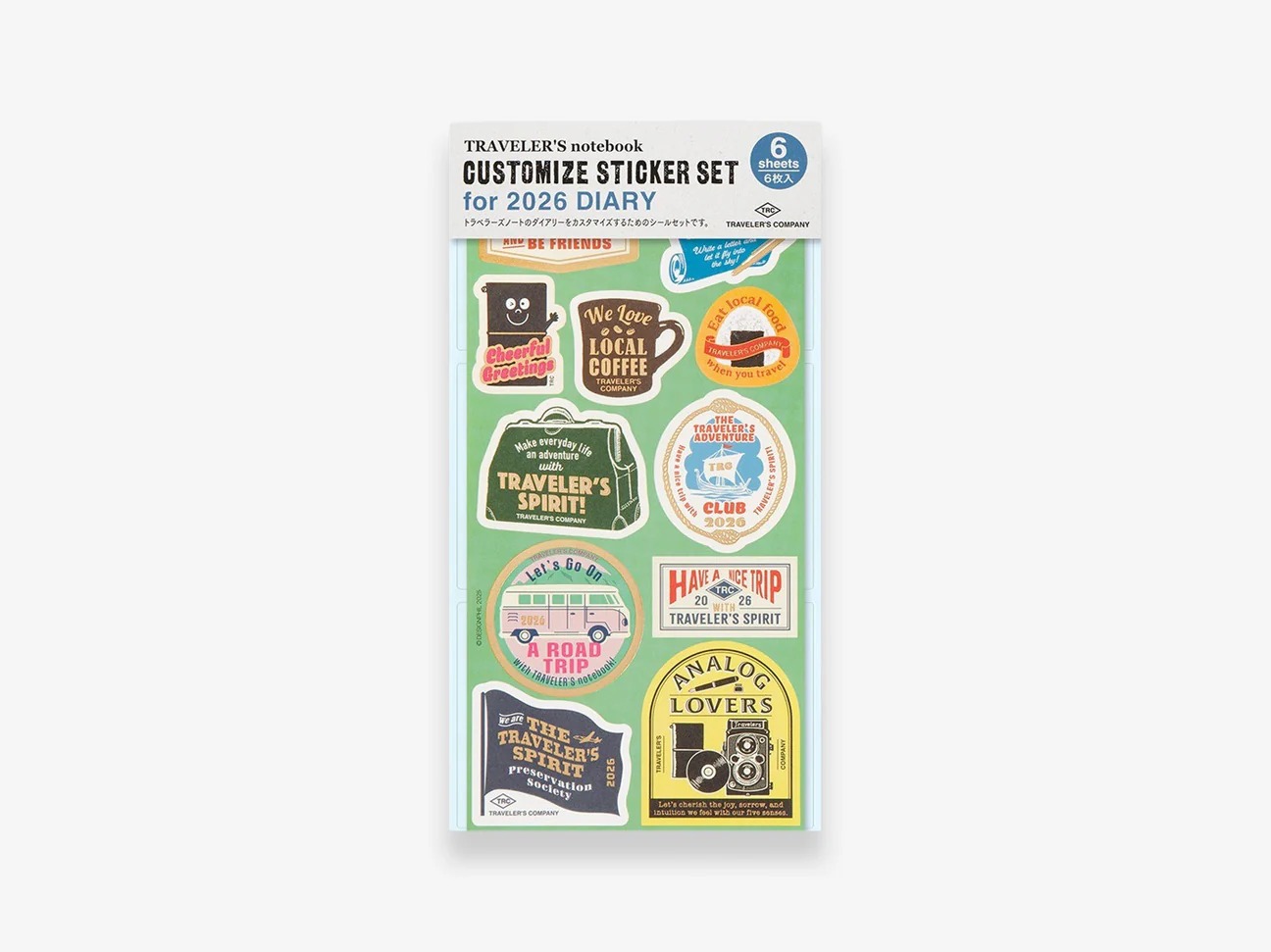 The 2026 TRAVELER’S Notebook Diary Customize Sticker Set is a sticker set for customizing your TRAVELER’S notebook that makes it more fun, including index and pocket stickers, icon stickers to represent different plans, dry transfer, and stickers to decorate the cover.