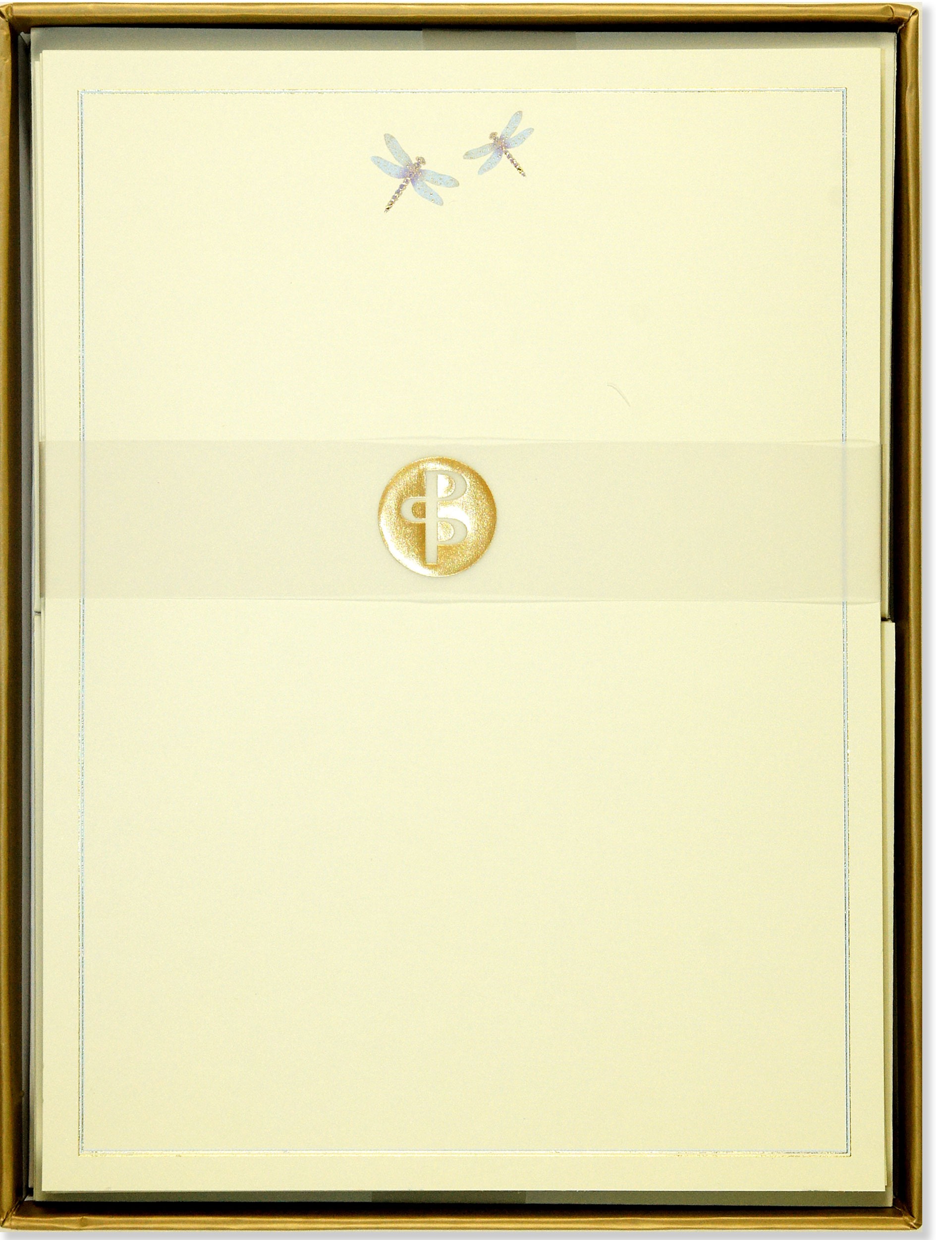 Twin dragonflies, in shades of soft lapis lazuli, soar at top of each stationery sheet, illuminated by touches of gold foil. Raised embossing adds dimension.