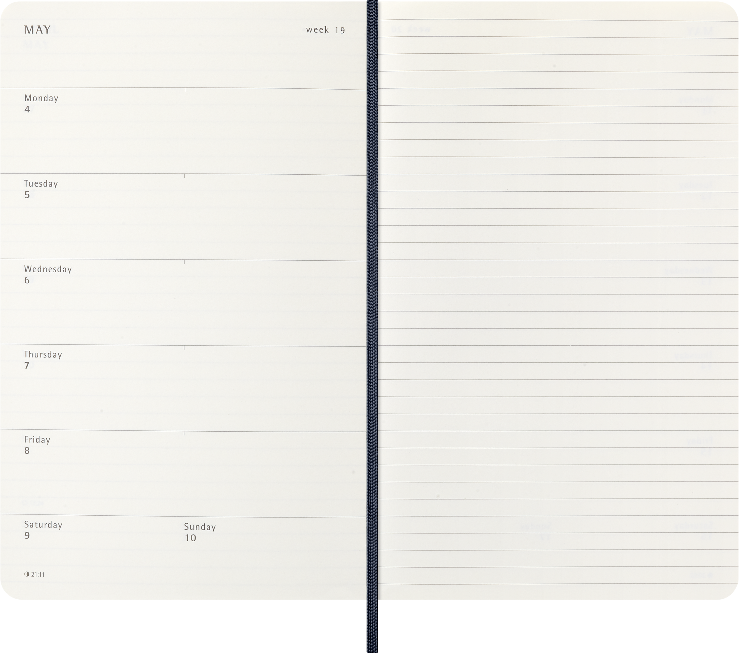 Det är enkelt att hålla koll på veckan med denna populära 12-månaders notebook kalender från Moleskine. Daterad från januari till december med alla veckans dagar på vänster sida och plats att skriva och rita på höger sida. Innehåller dessutom års- och månadsöversikt.