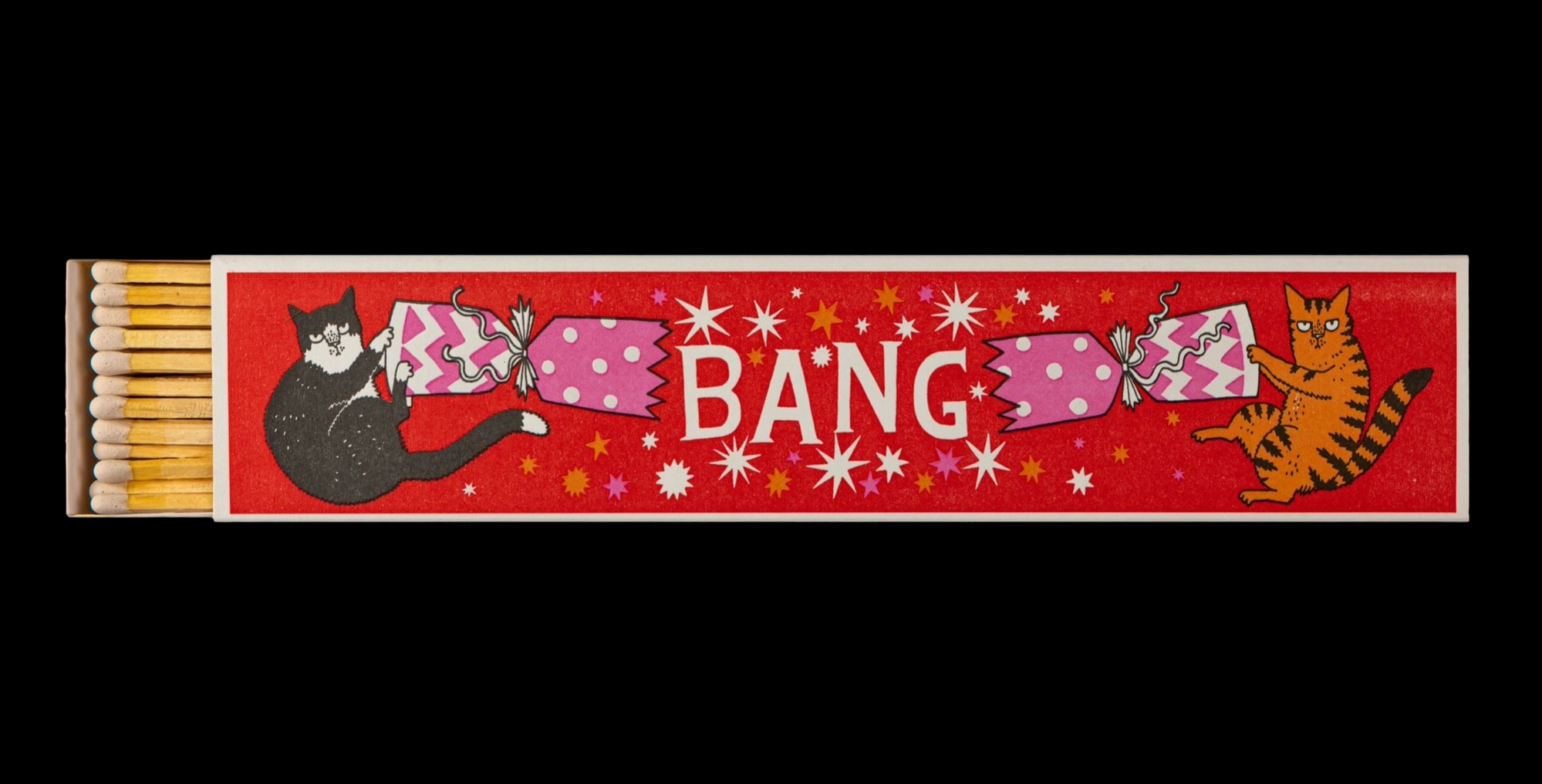 Our long matchbox featuring two cats pulling a pink Christmas cracker with the word ‘BANG’ in the middle on a red background.