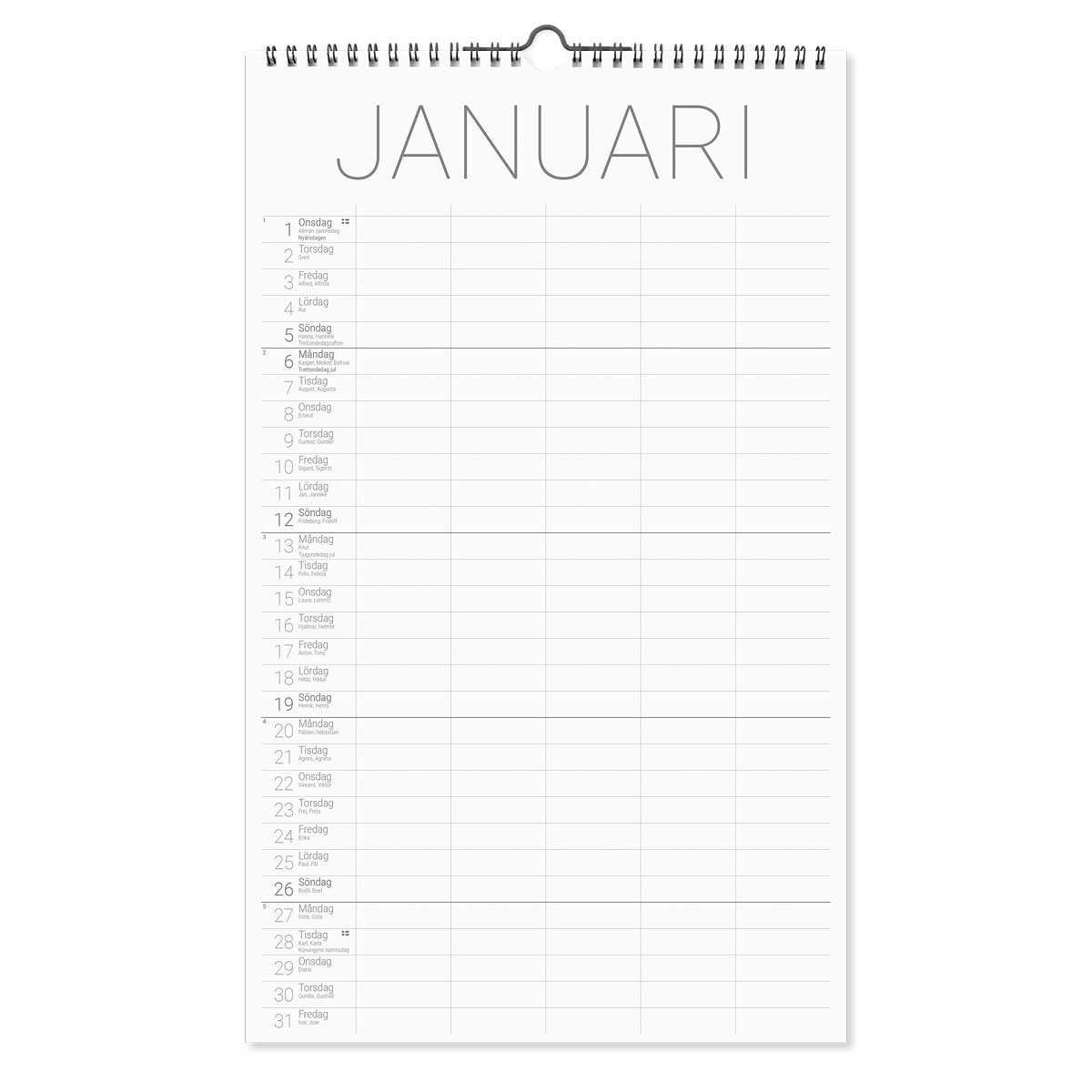 En familjekalender 2026 som ger dig möjlighet att fylla i aktiviteter, händelser eller bemärkelsedagar. Med sina fem kolumner ger kalendern en snabb överblick över familjens aktiviteter hela året. En familjekalender för dig som gillar en mer avskalad design.