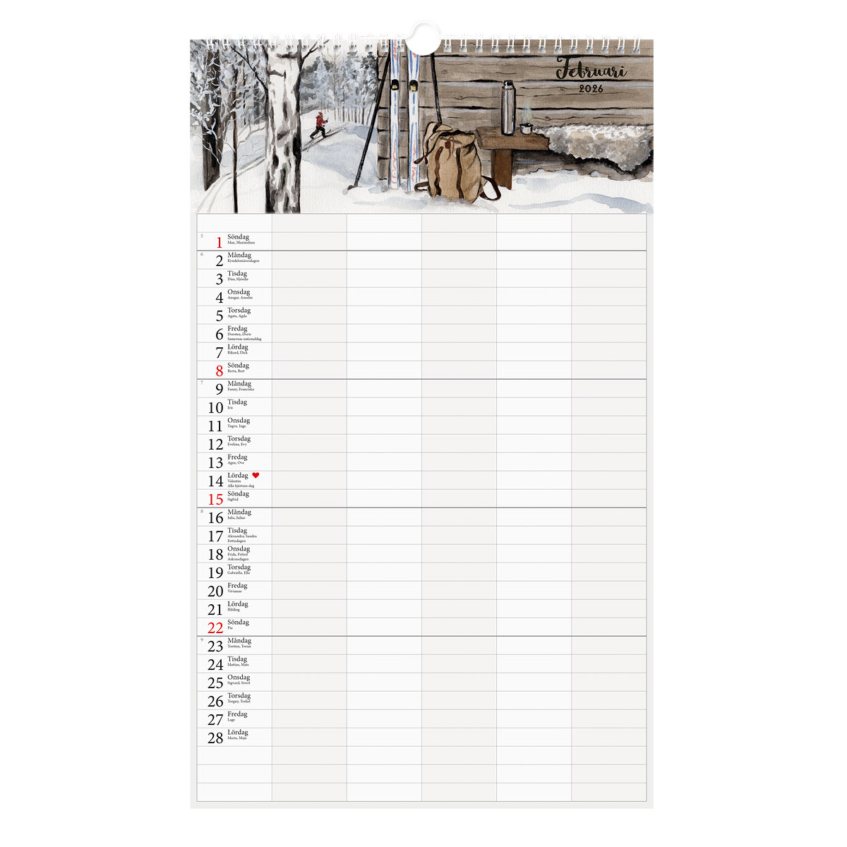 En Familjekalender för 2026. Med sina fem kolumner ger kalendern en snabb överblick över familjens aktiviteter hela året. Härliga illustrationer av Kajsa Hagelin. Sträcker sig från januari 2026 till december 2026.