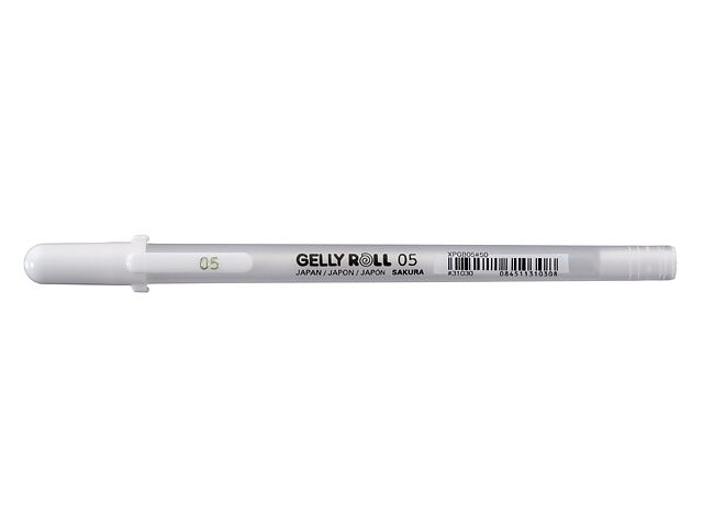 Gelly Roll är en vattenbaserad pigment, arkivbeständig gelpenna med vitt bläck. Täcker bra även på mörkare underlag.