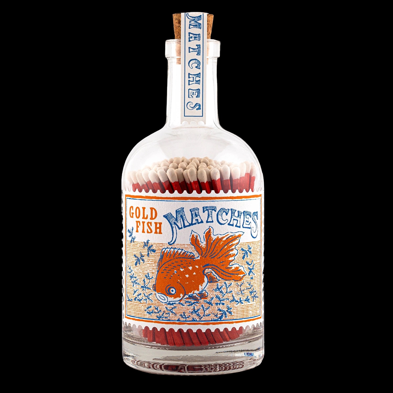 Our match bottle featuring our vintage stamp-inspired label showing a goldfish swimming under the water with the words ‘Goldfish Matches.’