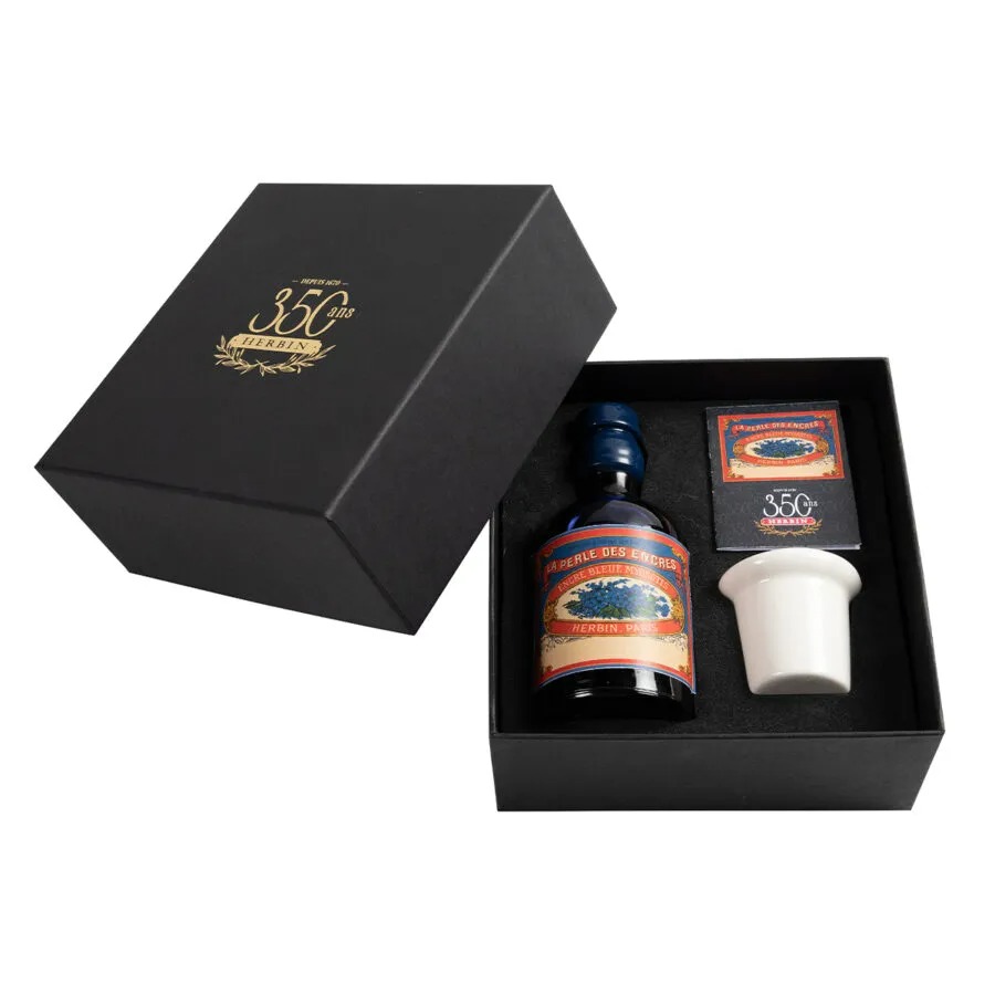 Denna låda, mycket elegant tack vare sin heta förgyllning på locket, lanserades för att markera 350-årsjubileet för varumärket Jacques Herbin. Den innehåller 1 flaska 100 ml vaxat bläck med en etikett som motsvarar originalet och ett bläckhus i porslin som refererar till det som används av generationer av skolbarn. Meddelandet presenterar historien om företaget Jacques Herbin och bläckets historia. Franska tillverkade.