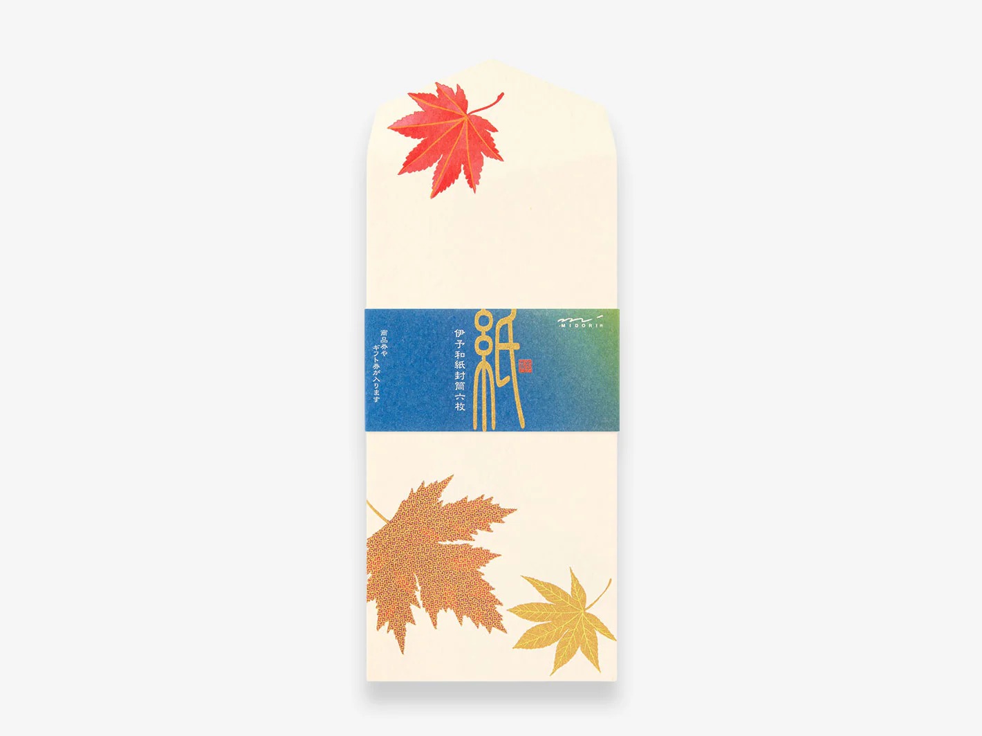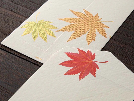 The Kami Series Fallen Leaves Envelopes reflect the colors of autumn on the beautifully textured washi paper with a thousand-year tradition. Gold silk printing is added to express the vibrant colors of the leaves, using “Echizen Torinoko”, cream Japanese paper with a gentle texture.
