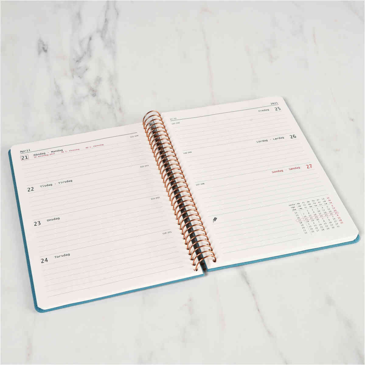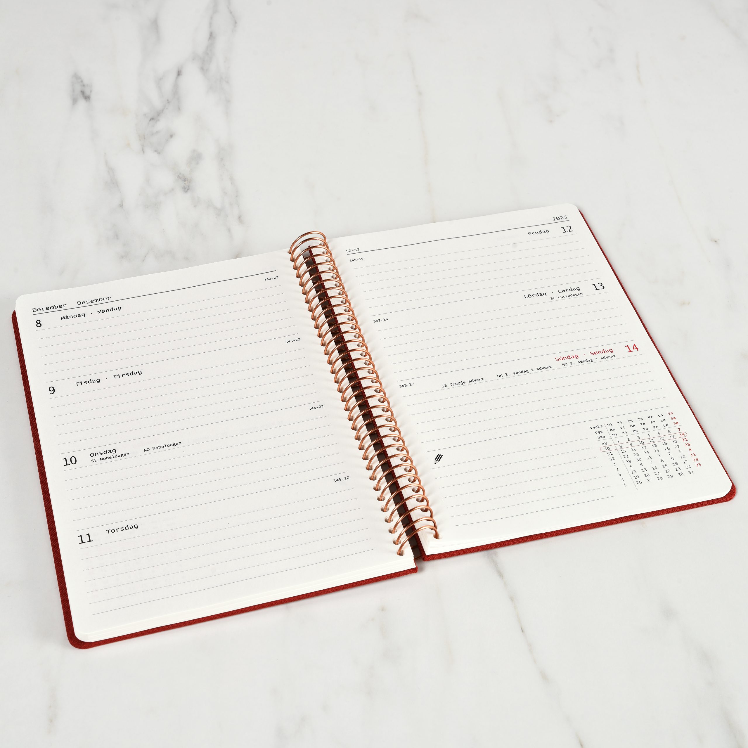 Det hårda omslaget och den kaxigt stora ryggspiralen gör det enkelt att öppna och skriva i kalendern även när du är på resande fot. Kalendern innehåller elegant crème färgat papper och är klädd i ett lyxigt canvastyg med detaljer präglade i brons. Minimalistisk liggande layout med en vecka per uppslag, där du har lika mycket plats för planering på alla veckans dagar. I varje uppslag har du dessutom plats för anteckningar och en smidig översikt över kommande veckors datum. Kalendern innehåller årsöversikter med helgdagar för 2025 och 2026 för Sverige, Danmark och Norge, årsplaneringar, plats för personlig information och linjerade sidor för egna anteckningar. Språk: Svenska, danska och norska. Kalendarium: 30 dec 2024 – 4 jan 2026. FSC återvunnet papper.