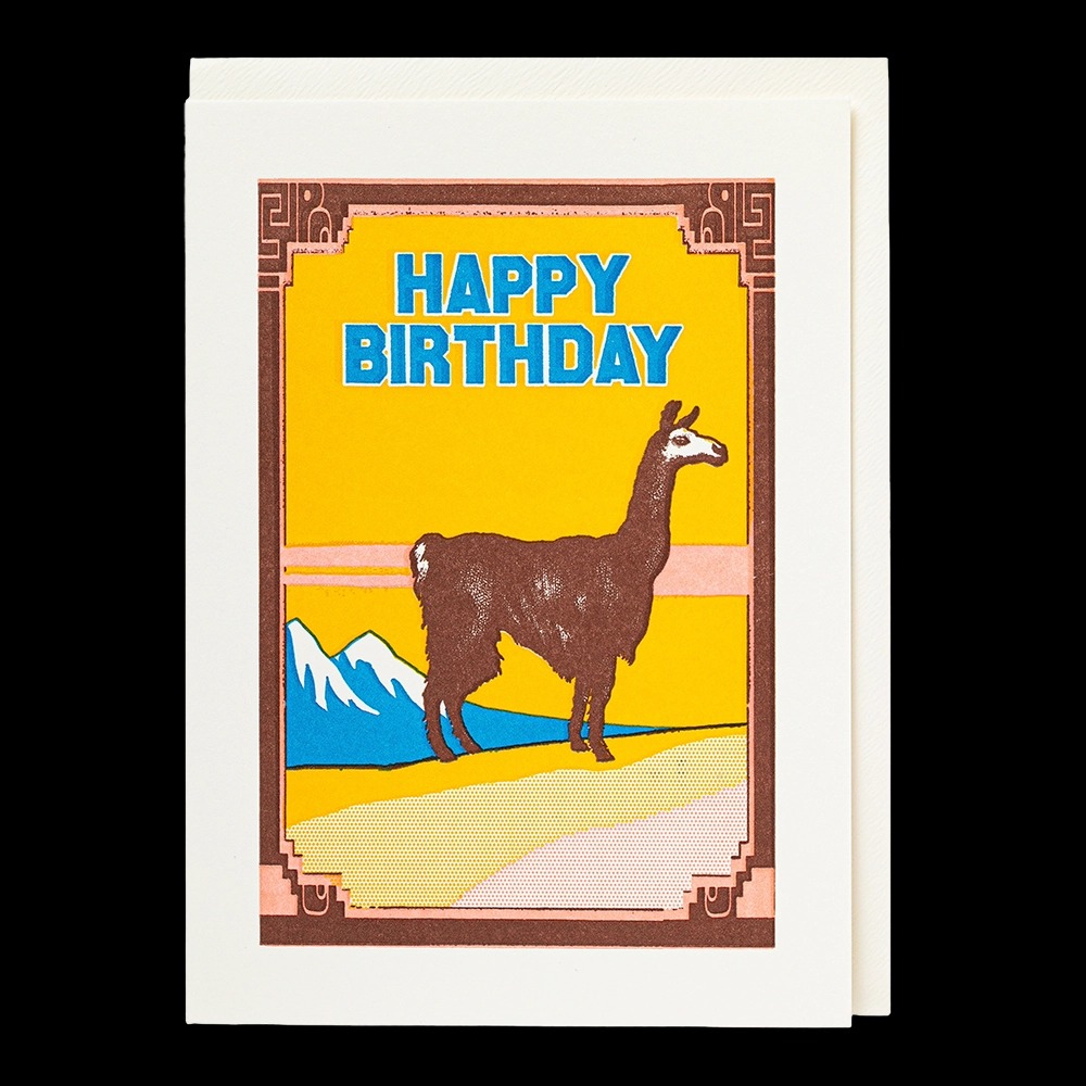 Our letterpress greetings card featuring a llama standing in front of a mountain range with a brown decorative border and the words ‘Happy Birthday’ in blue.