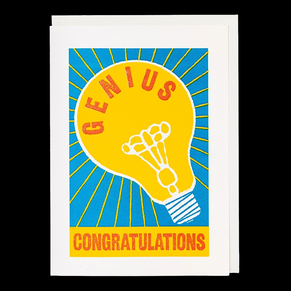 Our letterpress greetings card with a bright blue background featuring a bright yellow lightbulb with the words ‘Genius, Congratulations.’