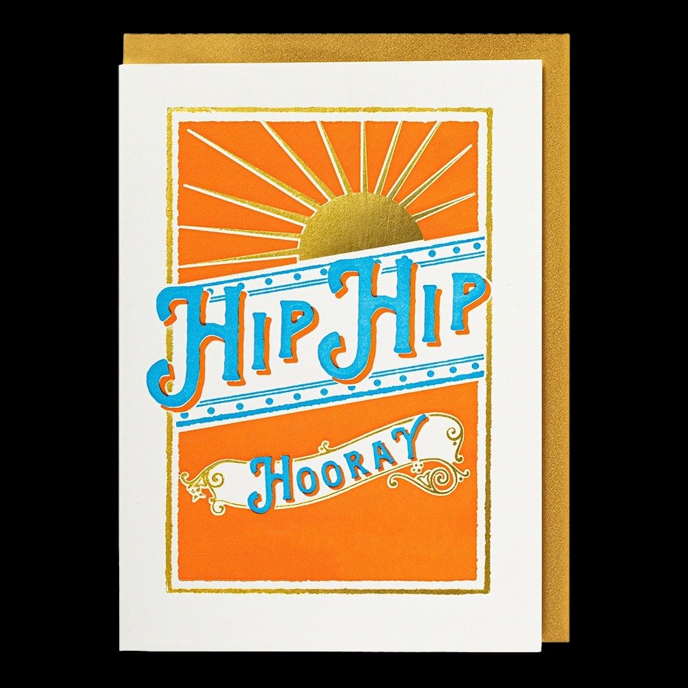 Our letterpress greetings card with the words ‘Hip Hip Hooray’ in bold, gold foil type on an orange background with a gold foil sun and border.