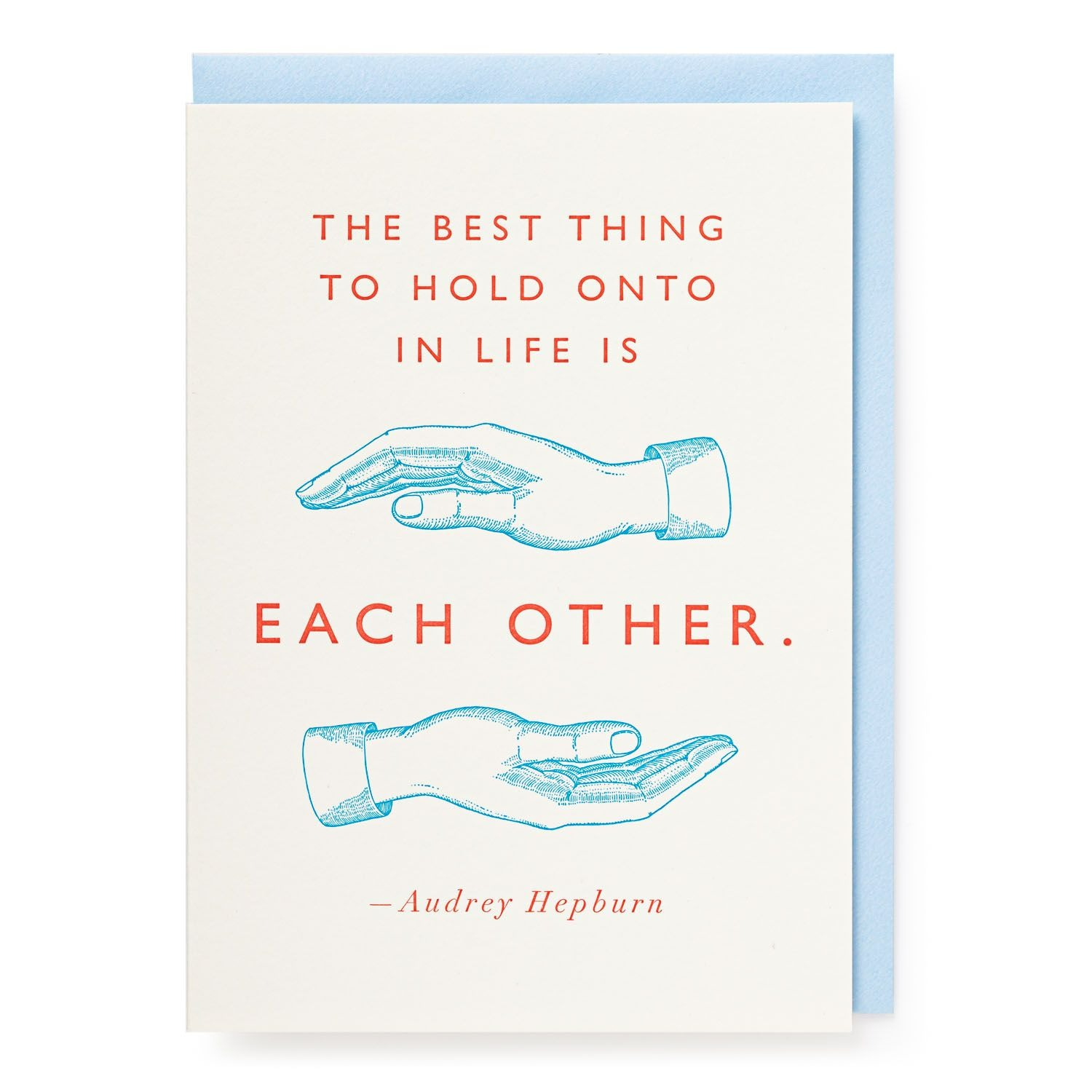 Our letterpress greetings card featuring two hands with outstretched palms with the words ‘The best thing to hold onto in life is each other.’