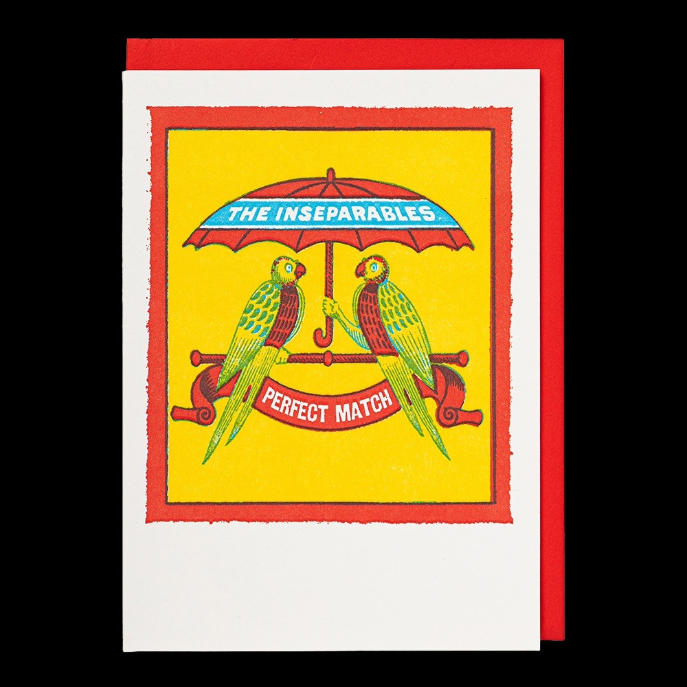 Our letterpress greetings card with a bold yellow background featuring two birds perched on a branch under an umbrella with the words ‘The Inseparables, Perfect Match.’