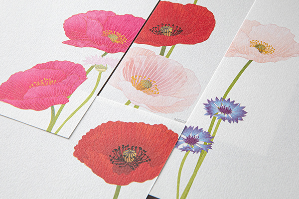 These note cards feature an assortment of bright red and pink poppies, inspired by a field of poppies swaying in the spring