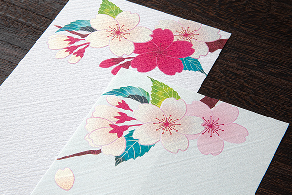 depicts cherry blossoms in a lustrous pink. The pale pink cherry blossoms are layered with polarized pearl ink, which changes color depending on the angle and light, making them shine even more brilliantly. Perfect for