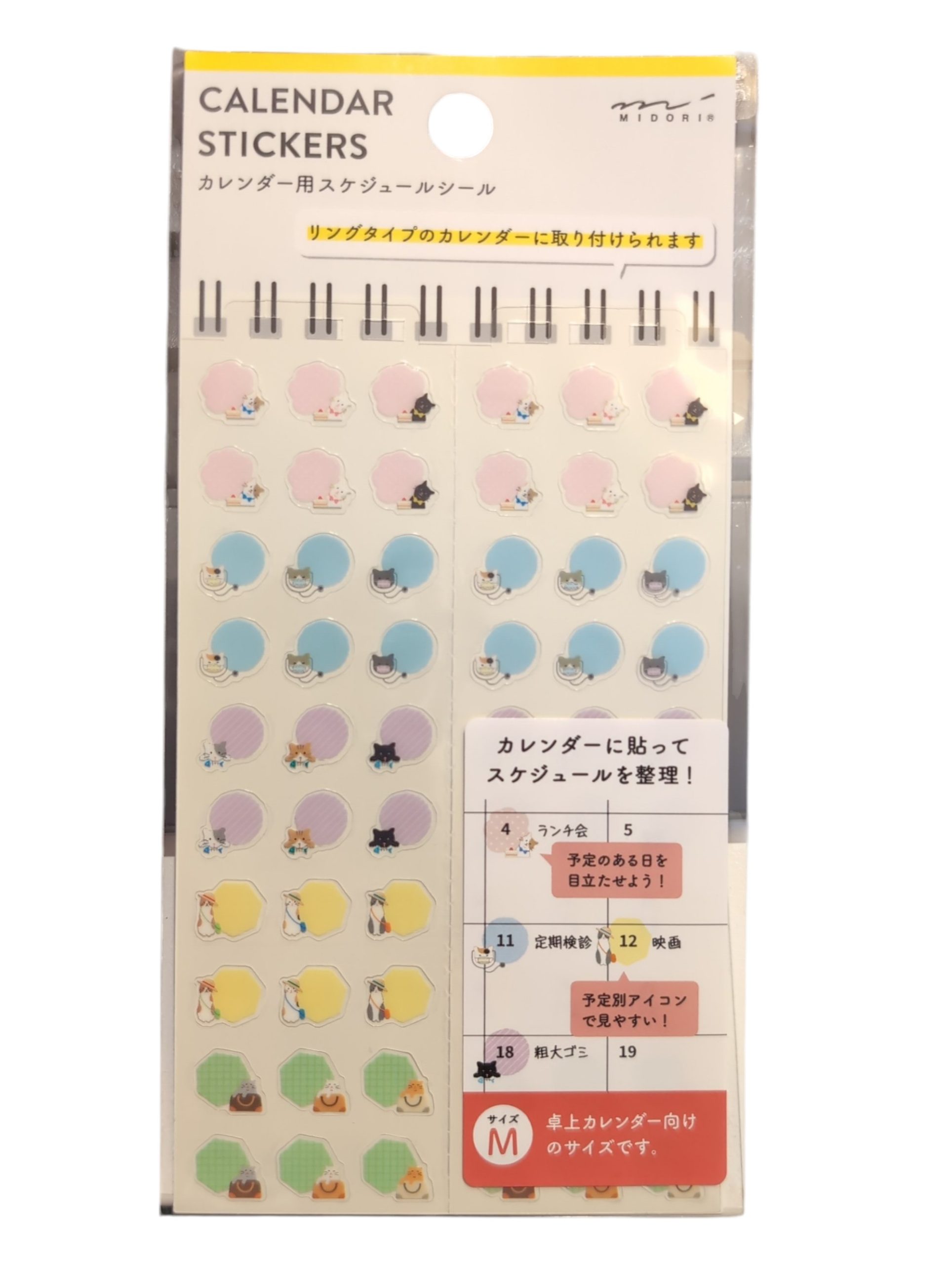 This calendar sticker is useful for managing your schedules, such as putting it on top of the date to make your appointments stand out. The cutout of the sheet can be attached to the ring of the calendar. The sheets are divided into 2 perforations in the center for convenient use in small increments or for two calendars at the same time. Medium is sized for tabletop calendar. Size: Length = 7.1 inches (180 mm), Width = 3.5 inches (89 mm), Thickness = 0.04Product Color Trend:Multicolor. illustrations Cover Pattern: Cat