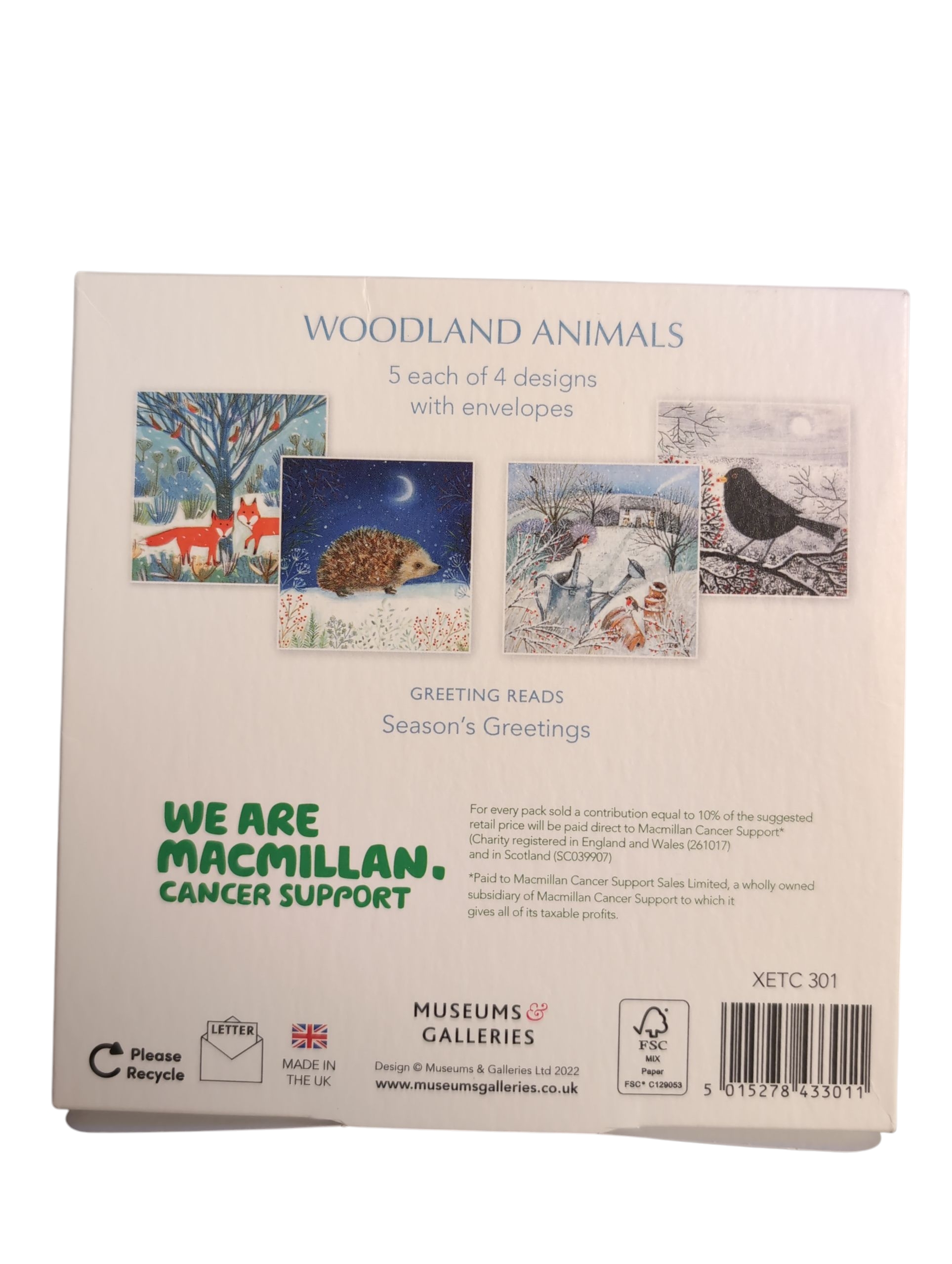 Museums & Galleries Pack of 20 Artistic Charity Christmas Cards – Woodland Animals – Lovely Illustration of a Winter Scene – 20 Cards of 4 Design, Multi, 135 x 137mm. A Pack of 20 High Quality Charity Christmas Cards and Envelopes from Museums & Galleries. Card Size: 135 x 137mm. The Greeting Inside Reads: Season’s Greetings. This Pack Contains 20 Cards of 4 Design. Sold in Aid of We Are Macmillan Cancer Support. Sold in Aid of We Are Macmillan Cancer Support. Made in the UK on Sustainably Sourced Board. These Cards, Envelopes and Packaging Can All Be Recycled.