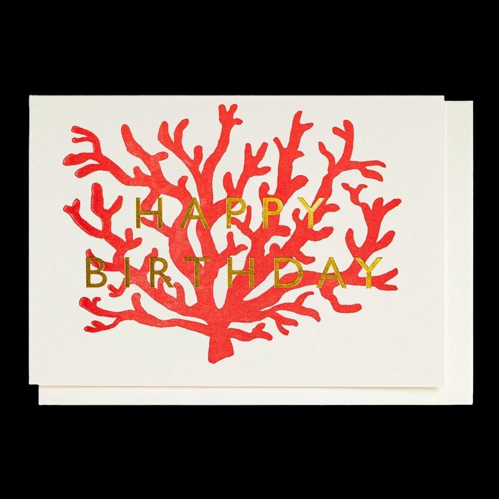 Our small letterpress card featuring a bright illustration of coral with the words ‘happy birthday’ in gold foil.