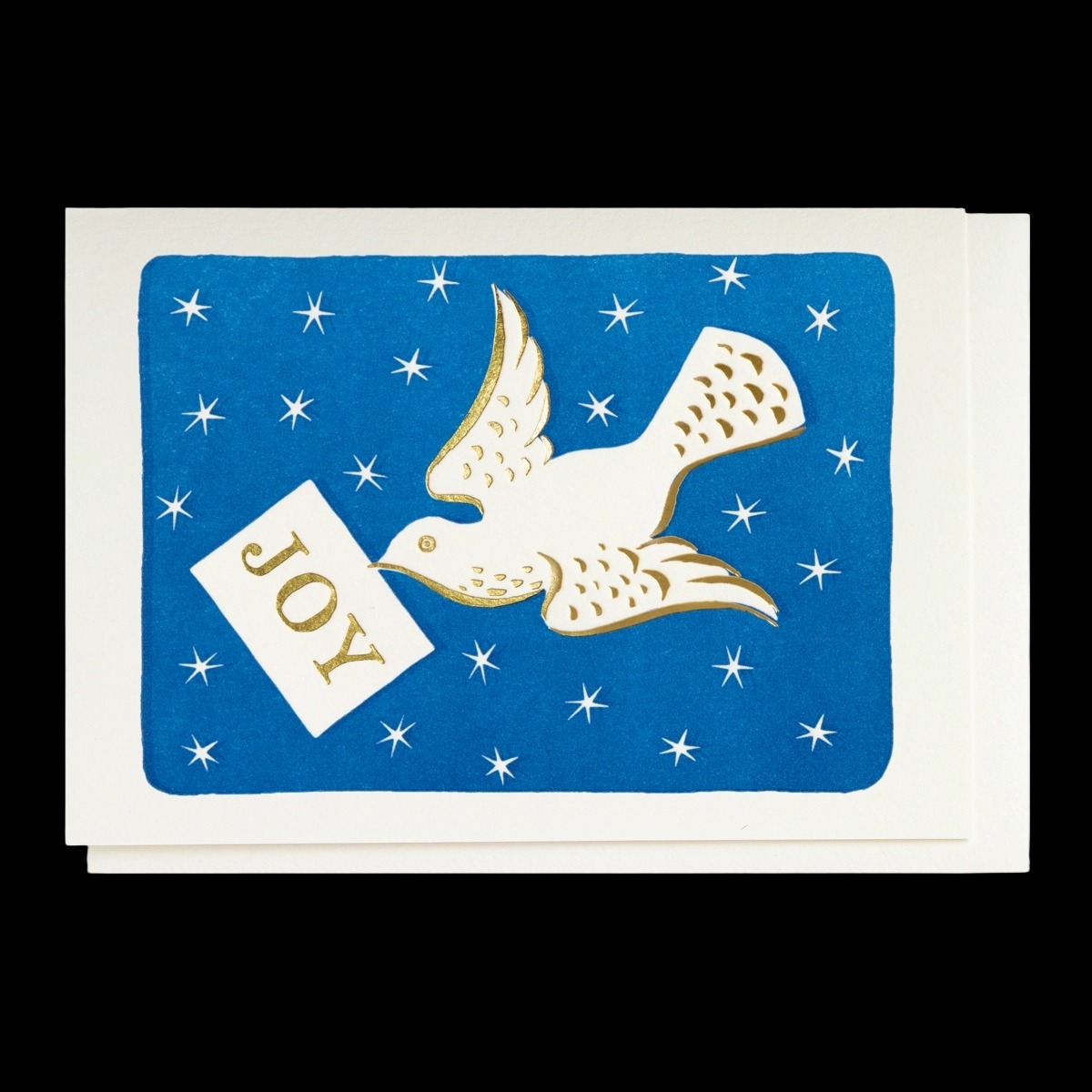 Our small letterpress card with a deep blue background featuring a white dove flying across a night sky with gold foil stars.