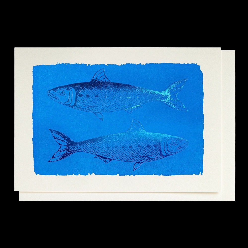 Our small letterpress card with a bright blue background featuring two blue foil sardines.