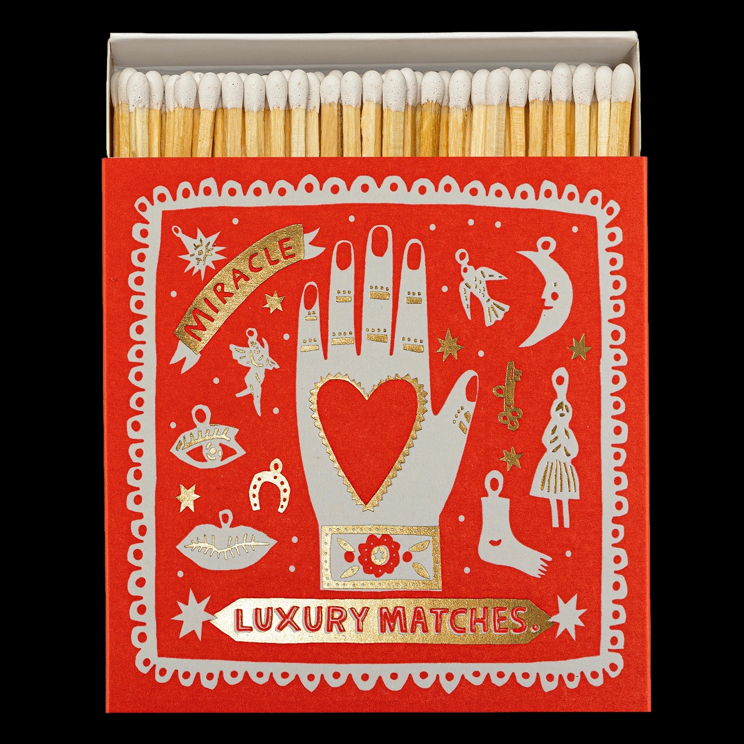 Our signature square matchbox featuring the illustration of a hand with a heart in the middle surrounded by an array of different charms and gold foil detailing with the words ‘Miracle Luxury Matches.’
