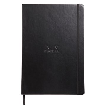 talian leatherette hard cover with embossed Rhodia logo 96 non-micro-perforated sheets 90 g brushed ivory vellum Clairefontaine paper 1 ribbon bookmark expanding inner pocket secured by elastic flat opening at 180° WebnoteBook A4 black A4 (21×29,7 cm) dot grid