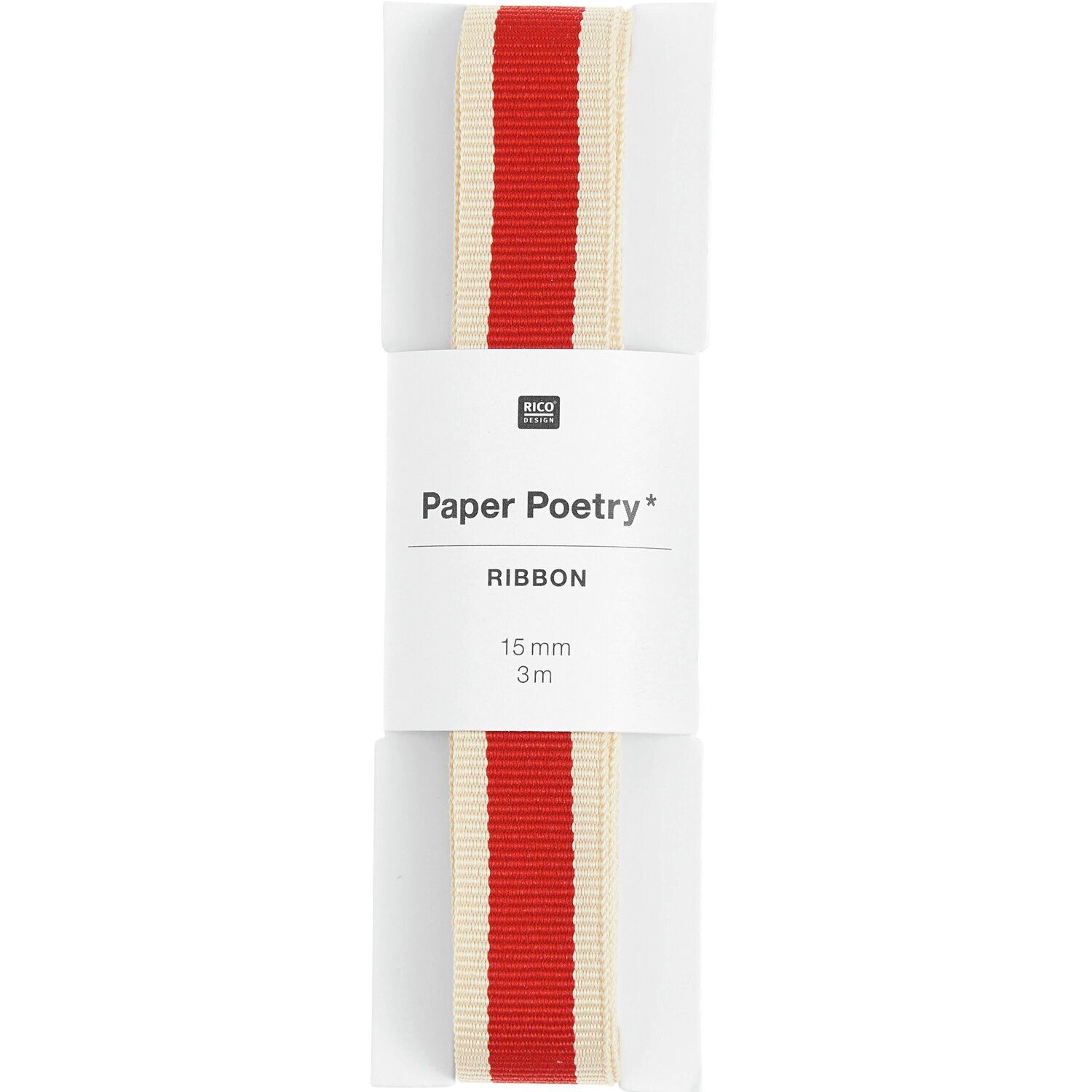 The ribbon with red and cream stripes is 15 mm wide and 3 m long. Made from 100% polyester, it comes in plastic-free packaging. It is ideal for gift wrapping, craft projects and decorative purposes.