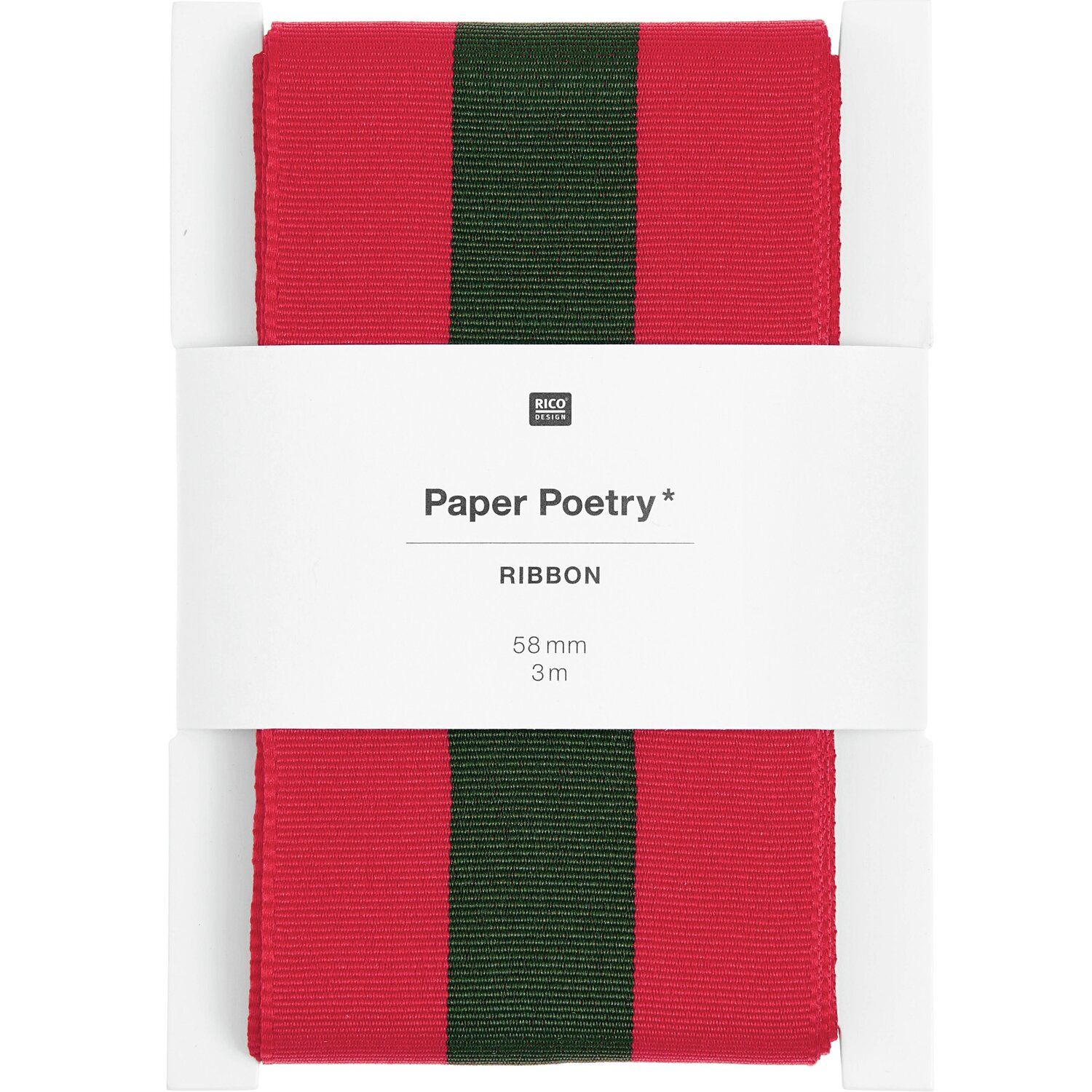 The ribbon with red and green stripes is 58 mm wide and 3 m long. Made from 100% polyester, it comes in plastic-free packaging. It is ideal for gift wrapping, craft projects and decorative purposes.