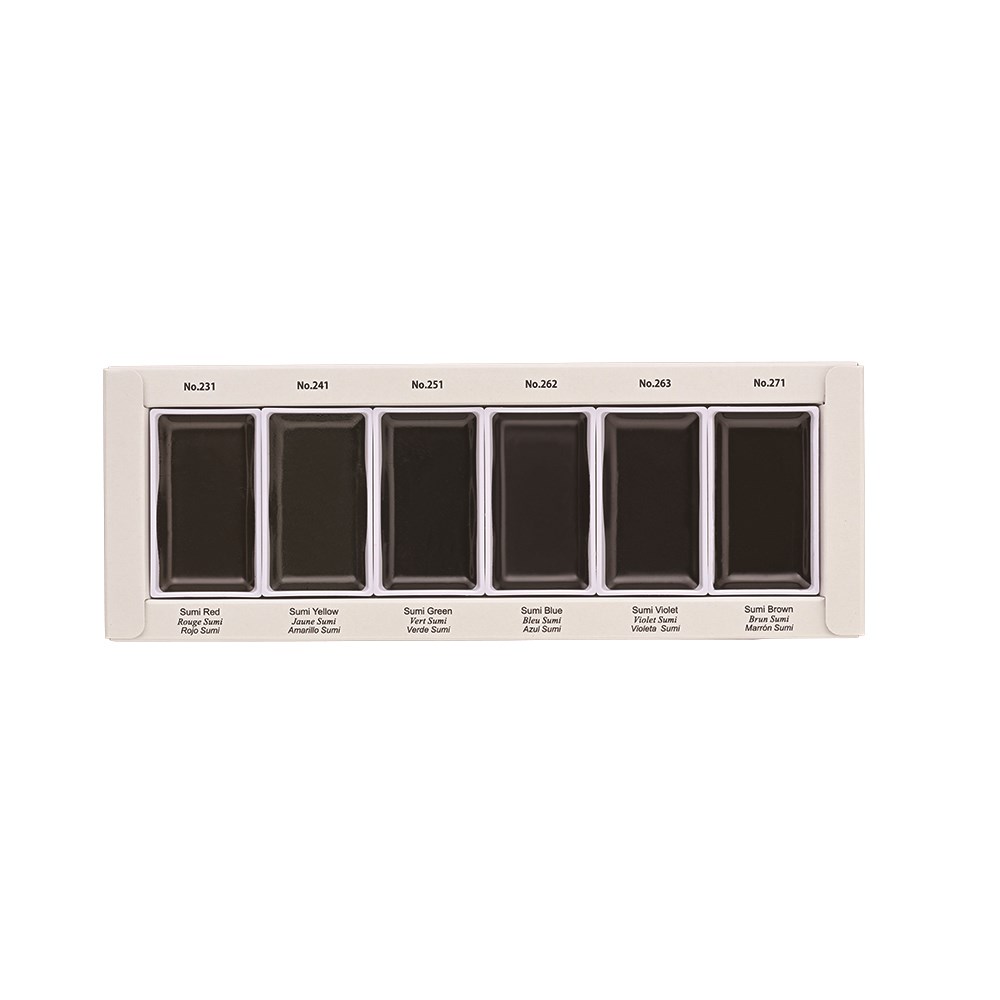 We have utilized the expertise and techniques developed over 120 years of ink making to develop these Gansai colors which have six particularly deep sumi-like color tones.